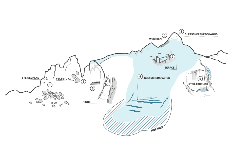 Im Hochgebirge lauern einige Gefahren: Stein- und Eisschlag, Absturz und Spalten oder Wechtensturz, Kälte, Hitze, Erschöpfung oder die Lawinengefahr. Verstärkt wurde dies in den letzten Jahren durch die Klimaerwärmung, speziell drohende Bergstürze oder auch Blockierungen durch den extremen Gletscherrückgang. Beziehe immer den Wetterbericht und die Auskunft von Ortskundigen über Wetterlage und Bedingungen am Gletscher in deine Planung mit ein. Unternehmungen in hochalpinem Gelände sind allein durch die Höhe und Witterung um einiges anspruchsvoller als normale Bergtouren. Aber sehr lohnend!