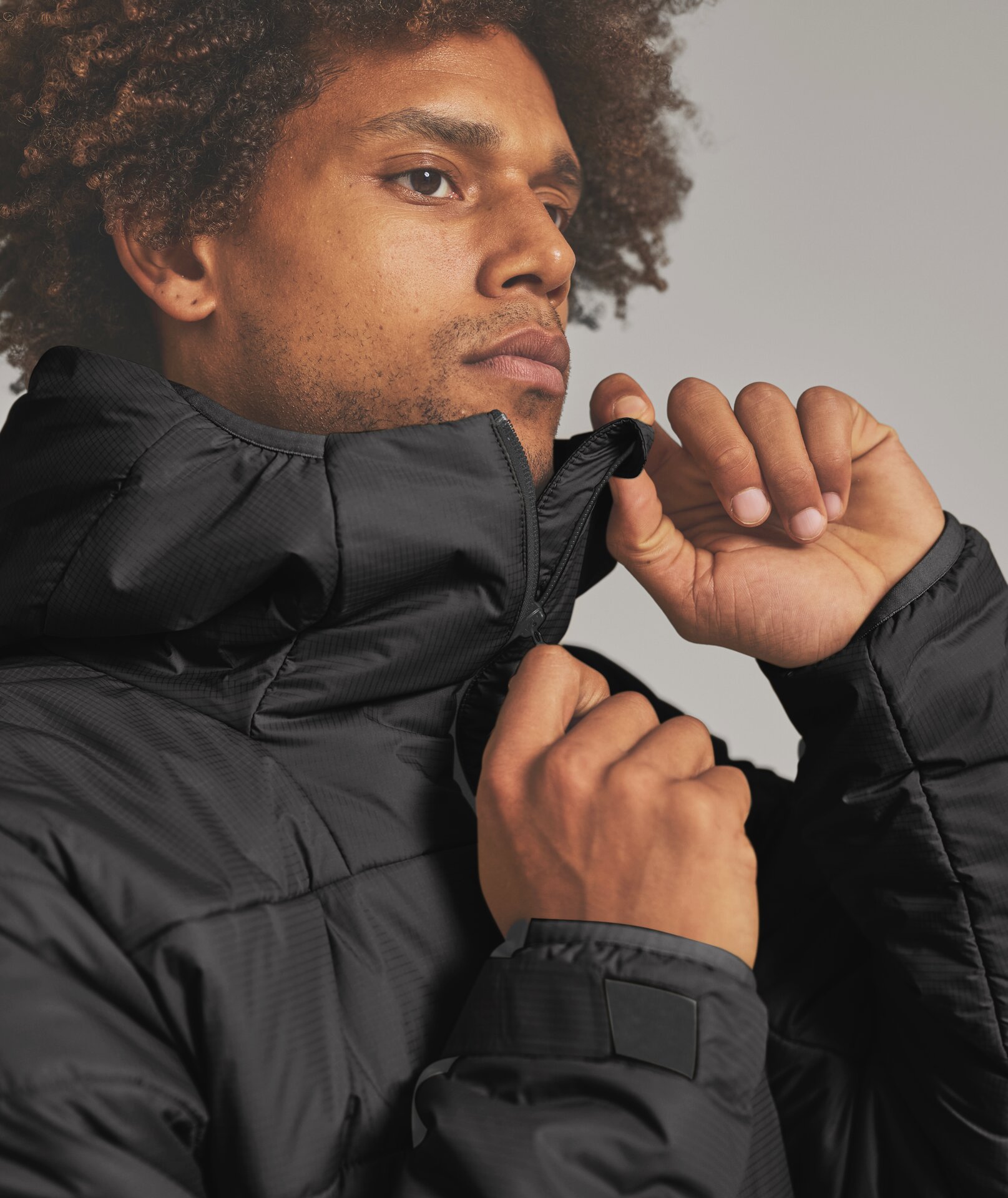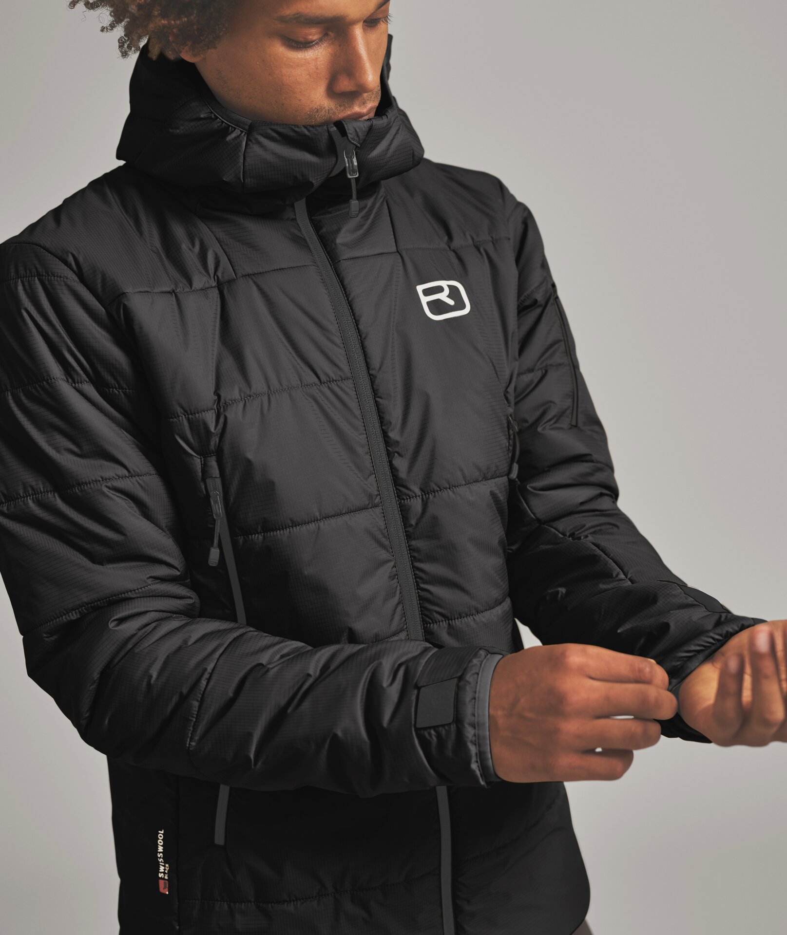 Robust PERTEX® QUANTUMmaterial provides protection on the outside, while Swisswool BLACK, the rare wool of the black sheep from the Swiss Alps, is used on the inside in varying weights: with a warm 150 g/m2 on the front and in the upper sleeve area, and a lighter 120 g/m2 in the hood and lower sleeve area.
